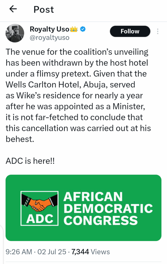 The Wells Carlton Hotel, Abuja, where the African Democratic Congress (ADC) unveiling is to be held, has abruptly cancelled the booking of the venue less than 24 hours before the event.