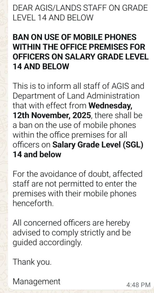The controversial directive, revealed in an internal memo obtained by SaharaReporters, targets all officers on Salary Grade Level 14 and below. It forbids them from bringing mobile phones into office premises starting Wednesday, November 12, 2025.