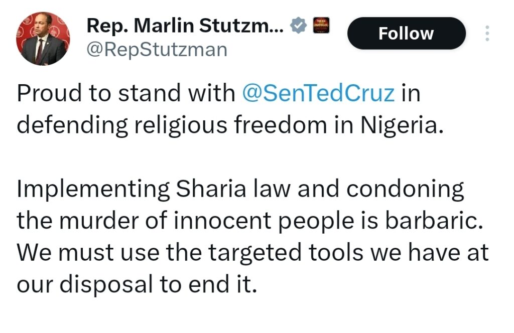 A United States lawmaker, Representative Marlin Stutzman, has joined Senator Ted Cruz in denouncing the alleged persecution of Christians in Nigeria, urging immediate action to protect the vulnerable community.