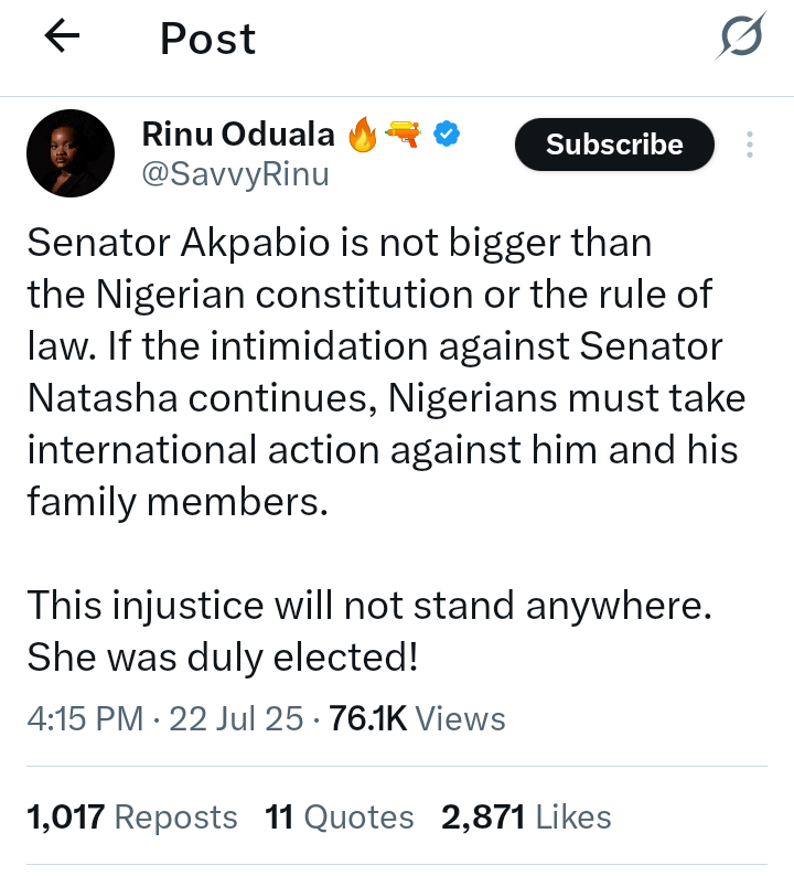 Human rights activist Rinu Oduala has urged Nigerians to take international action against Senate President Godswill Akpabio if he persists in the intimidation of Senator Natasha Akpoti-Uduaghan.