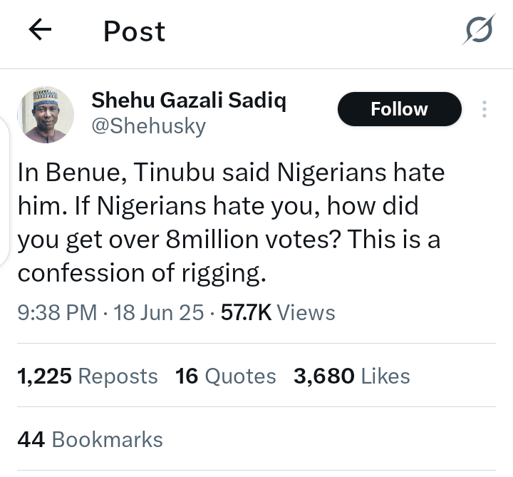 His post reads,”In Benue, Tinubu said Nigerians hate him. If Nigerians hate you, how did you get over 8million votes? This is a confession of rigging.”