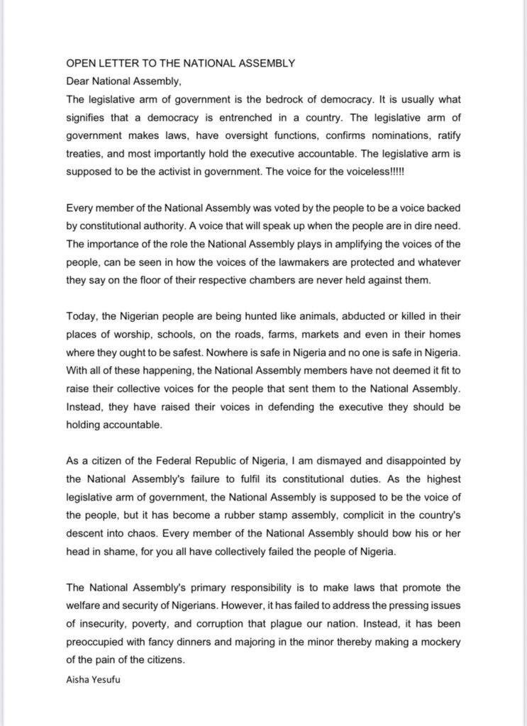 “As a citizen of the Federal Republic of Nigeria, I am dismayed and disappointed by the National Assembly’s failure to fulfil its constitutional duties. As the highest legislative arm of government, the National Assembly is supposed to be the voice of the people, but it has become a rubber-stamp assembly, complicit in the country’s descent into chaos,” she said.