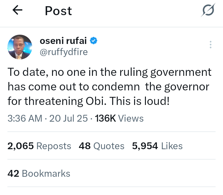 Reacting to the development, Rufai took to his official X handle and wrote l,”To date, no one in the ruling government has come out to condemn the governor for threatening Obi. This is loud!.”