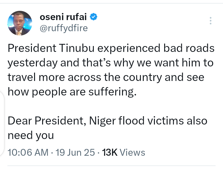 His post reads,”President Tinubu experienced bad roads yesterday and that’s why we want him to travel more across the country and see how people are suffering.