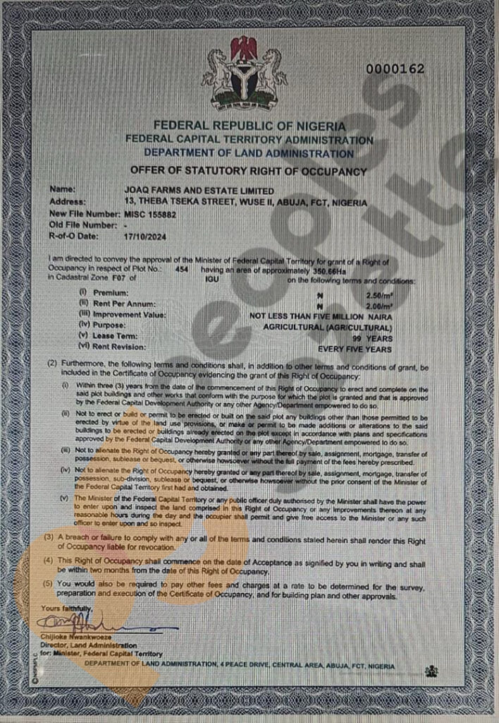On February 25, 2025, Mr Wike approved at least six certificates of occupancy for lands allocated to Joaquin across the Federal Capital Territory, according to records reviewed by The Gazette. The documents were in file series 159134, 159136, 159137, 159138, 159139 and 159140. While The Gazette could not obtain file 159135, officials said its allocation also went to Joaq Farms.
